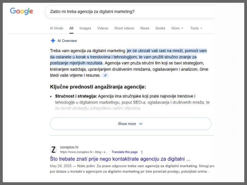 Osim toga, i samo ljudsko ponašanje se mijenja. Ljudi ne pretražuju samo "agencija za digitalni marketing". Sada pitaju: "Zašto mi treba agencija za digitalni marketing?" AI mode to prepoznaje.
