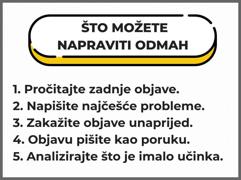 Rješenje: Napravite jednostavan raspored. Dvije objave tjedno, npr. ponedjeljak i četvrtak. Bolje te dvije nego pet u jednom danu pa ništa. Stvorite si ritam koji vam odgovara i držite ga se. Dosljednost je ta koja gradi povjerenje.
