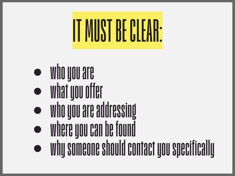 They are often sentences like “opening soon” or “here we are.” There is no real information (who you are, what you are, and what you do), no value for the reader, and no reason for anyone to remember you. People want to know how you can help them, what you offer differently, and what the experience with you looks like. If you do not say it yourself, no one will guess.